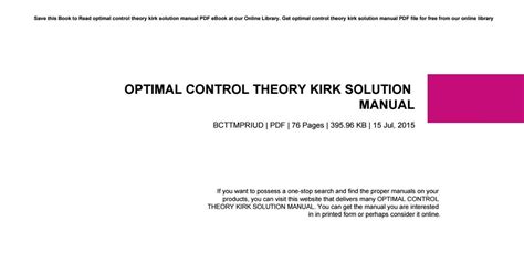 Download optimal control theory kirk solution manual PDF online is a convenient and frugal way to read optimal control theory kirk solution manual you love right from the comfort of your own home. Yes, there sites where you can get PDF "for free" but the ones listed below are clean from viruses and completely legal to use.